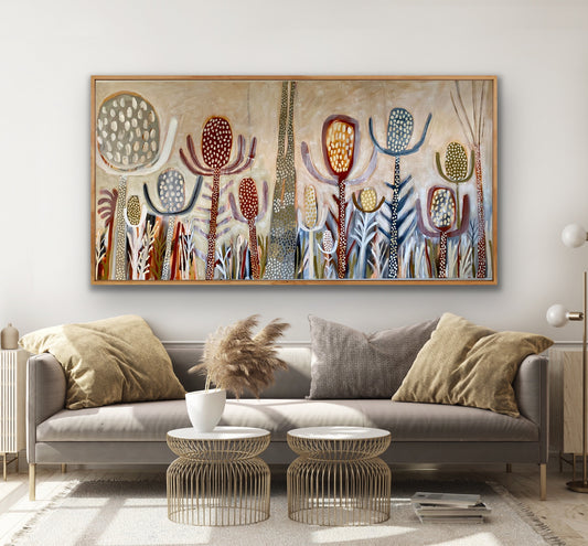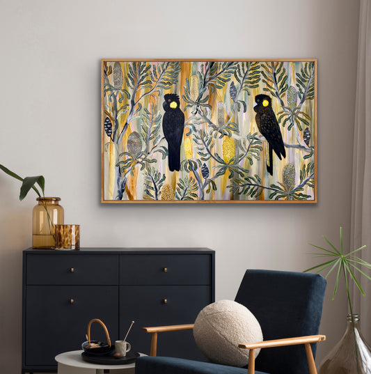 We are so thrilled with our black cockatoo commission. Kate was eager to listen to our ideas and worked with a palette that complemented both the furnishings in our space and the natural environment of the reserve we back onto. It's the perfect addition to our living room and we adore it.