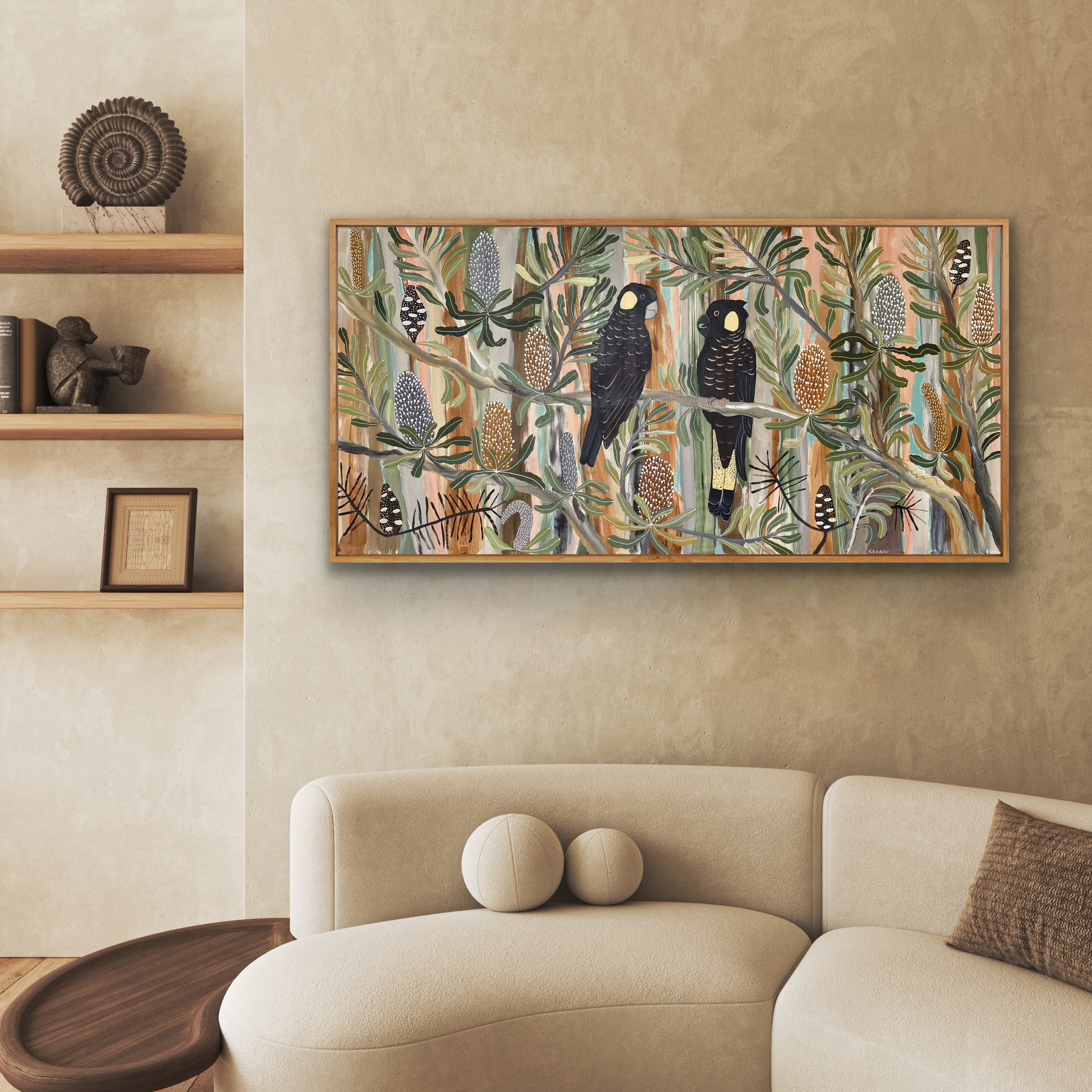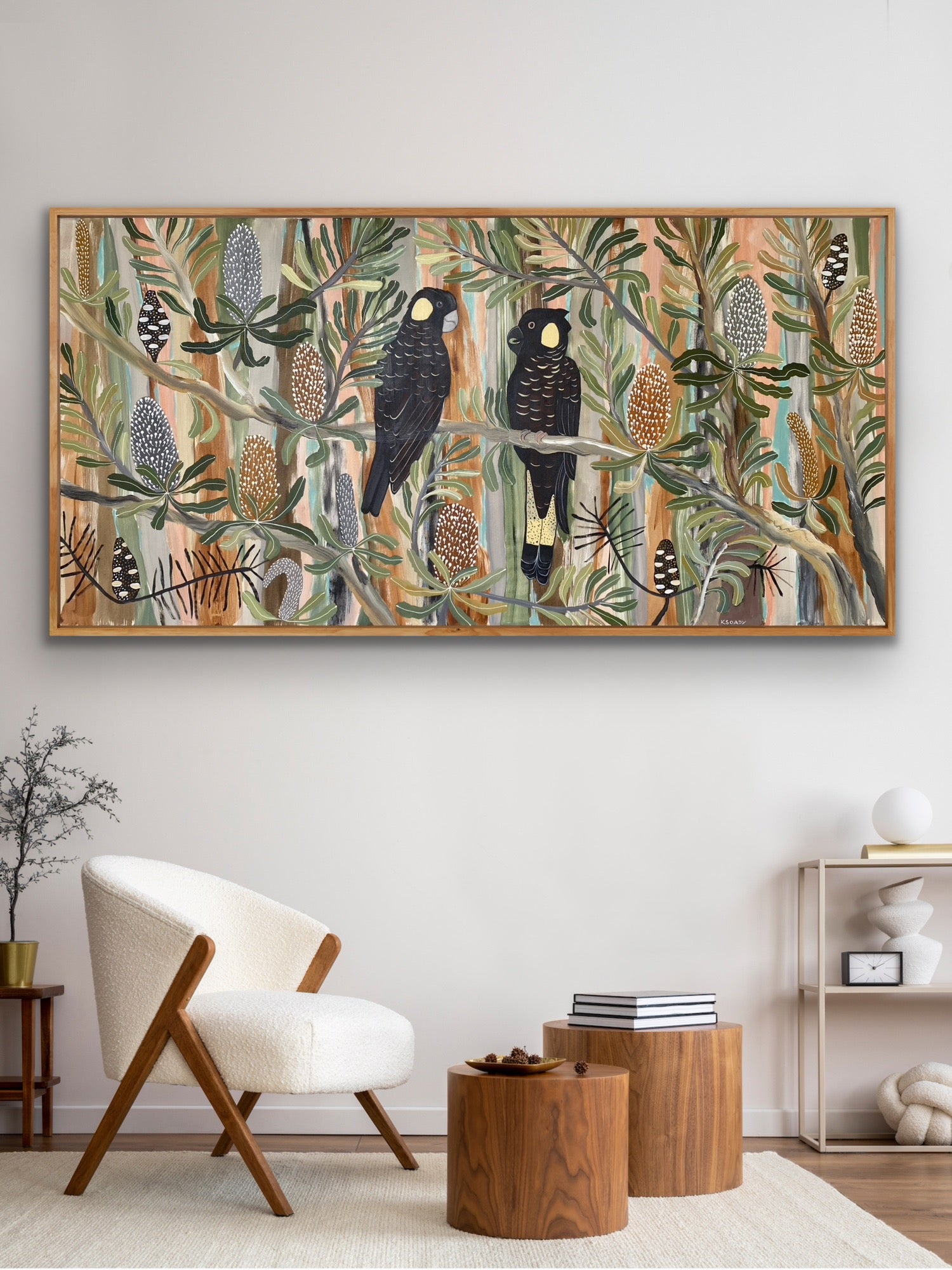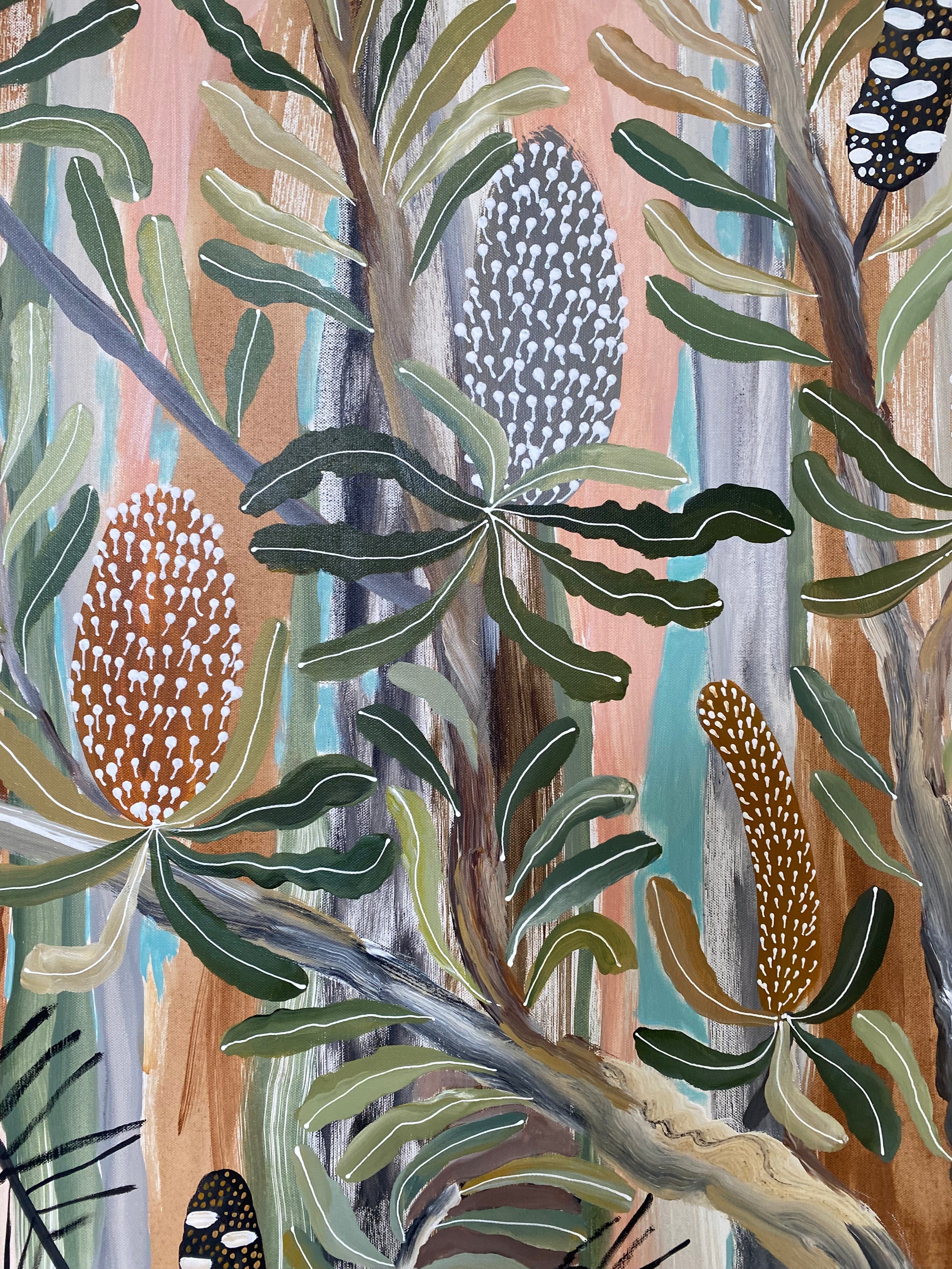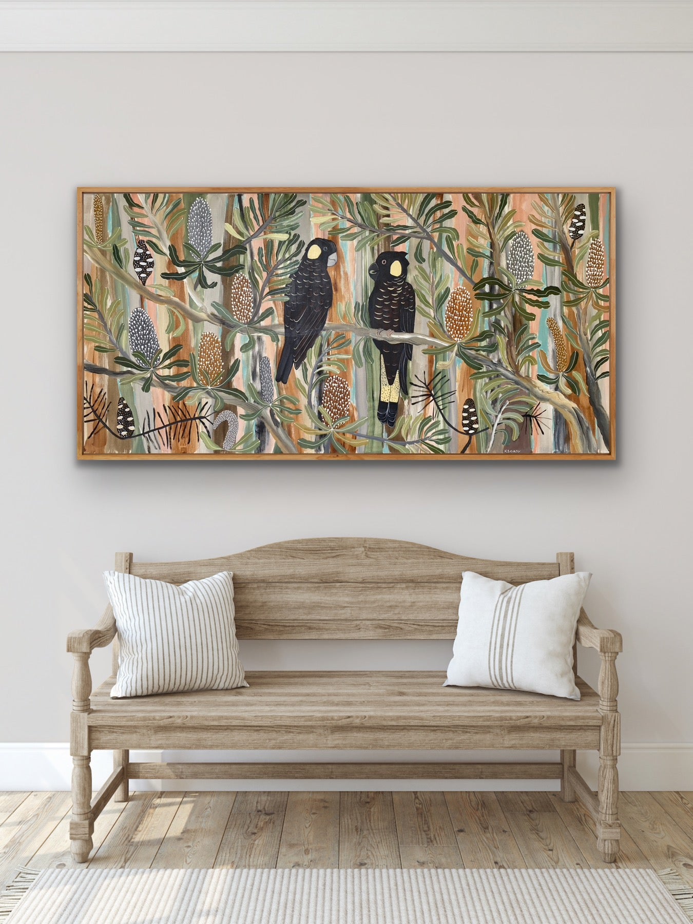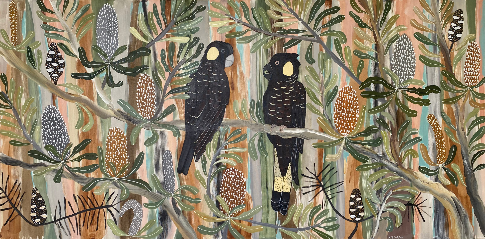 This semi-abstract painting depicts Australian native flowers and a pair of Black Cockatoos. There is a joyful wondrous exuberance in Kate's colourful native botanical artworks.