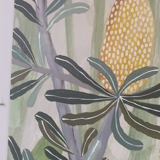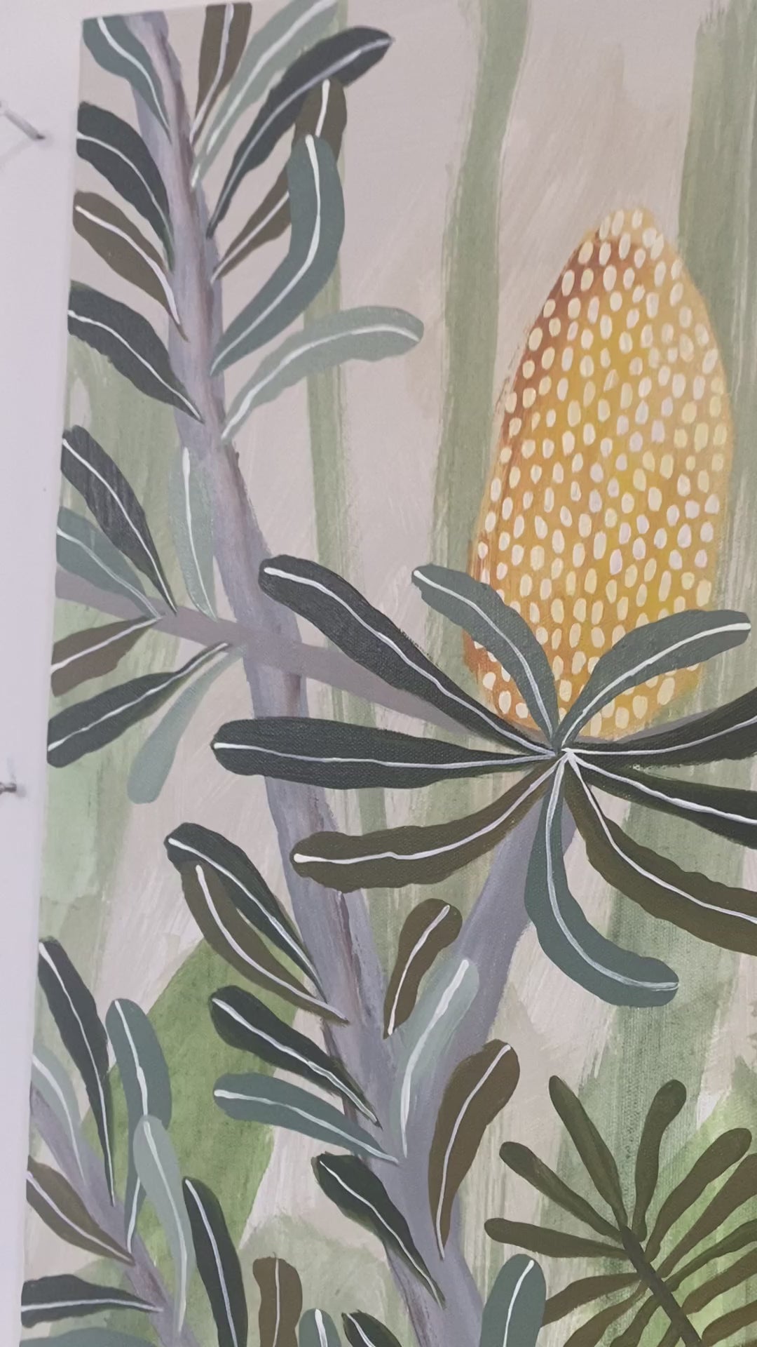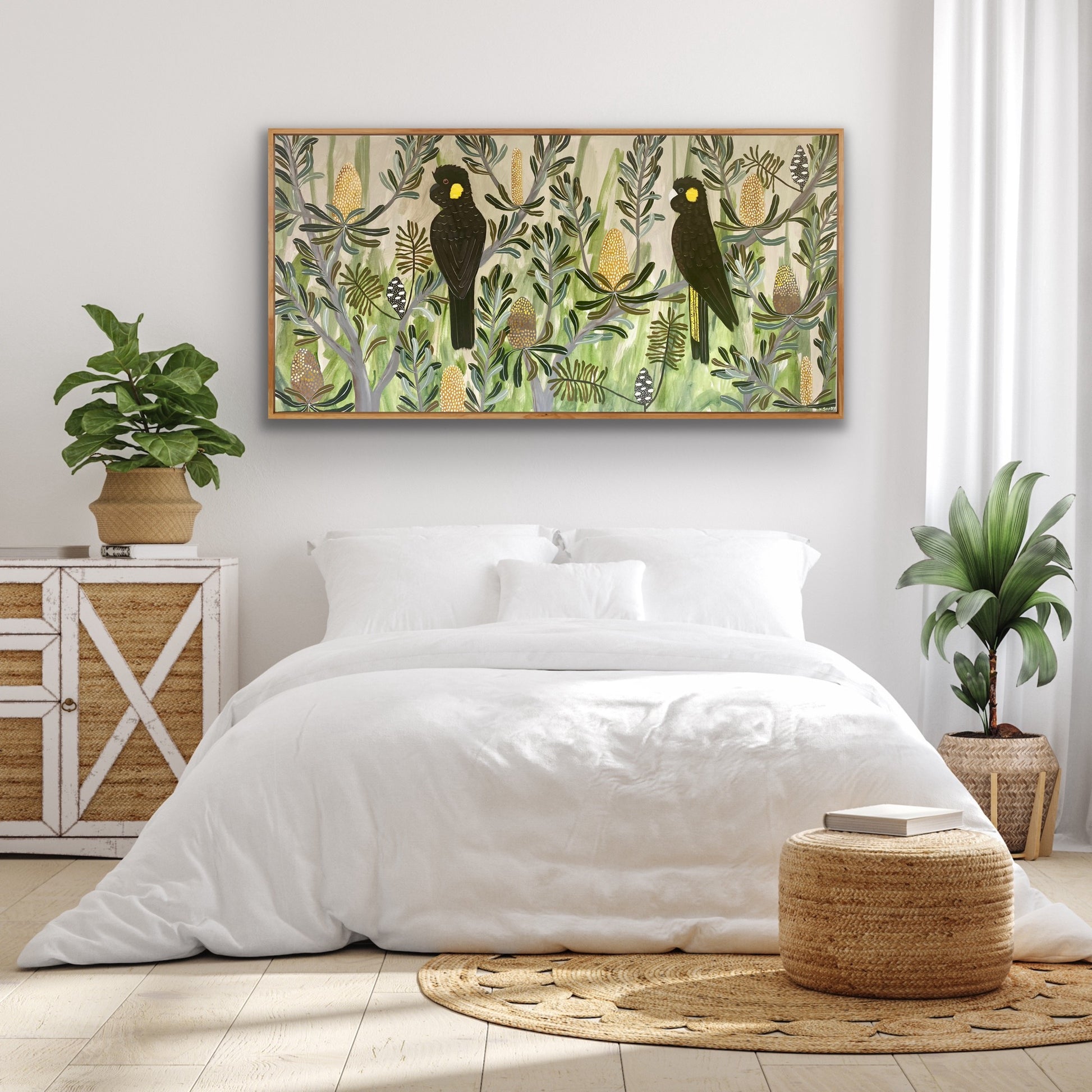 This semi-abstract painting depicts Australian native flowers and a pair of Black Cockatoos. There is a joyful wondrous exuberance in Kate's colourful native botanical artworks.