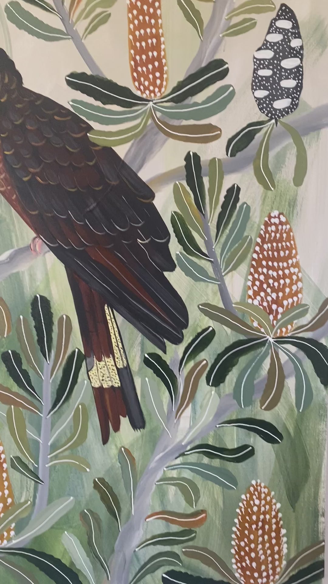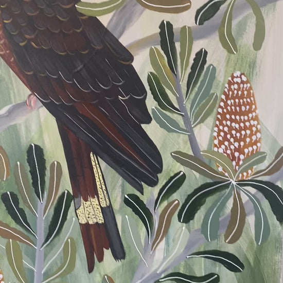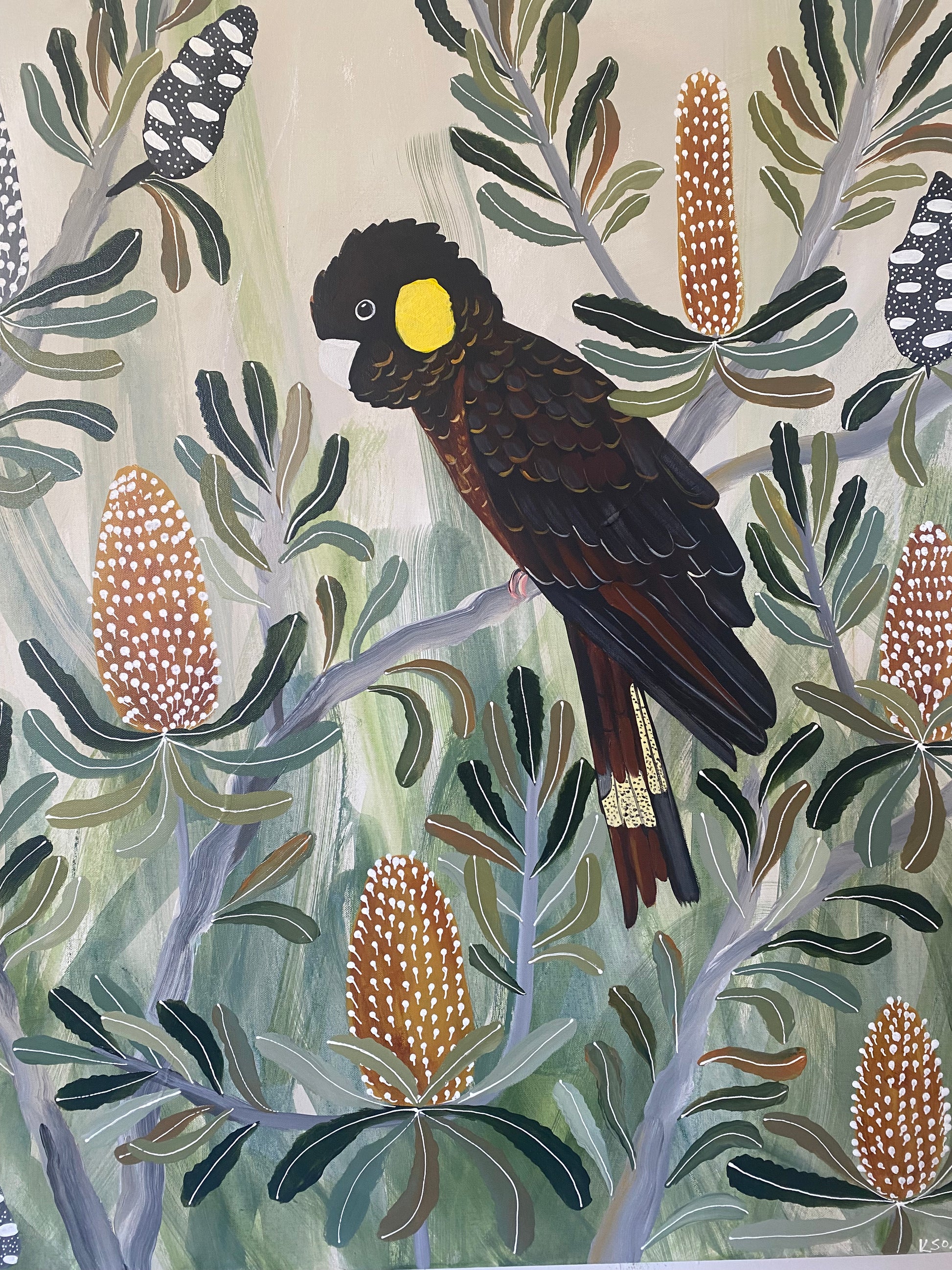 This semi-abstract painting depicts Australian native flowers and a pair of Black Cockatoos. There is a joyful wondrous exuberance in Kate's colourful native botanical artworks.