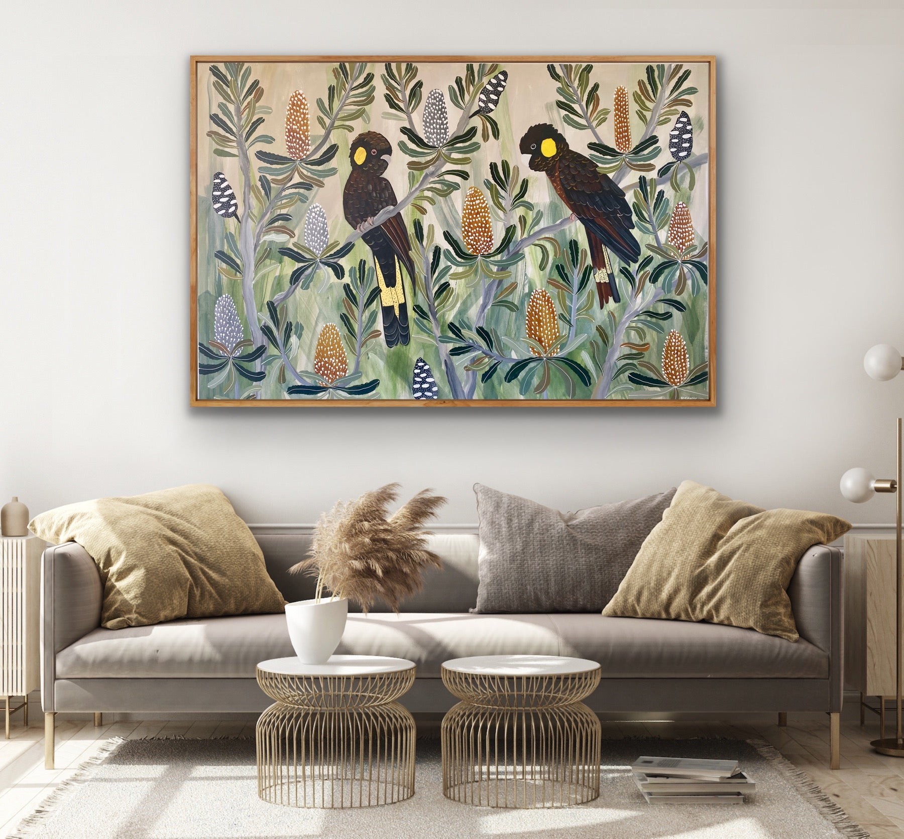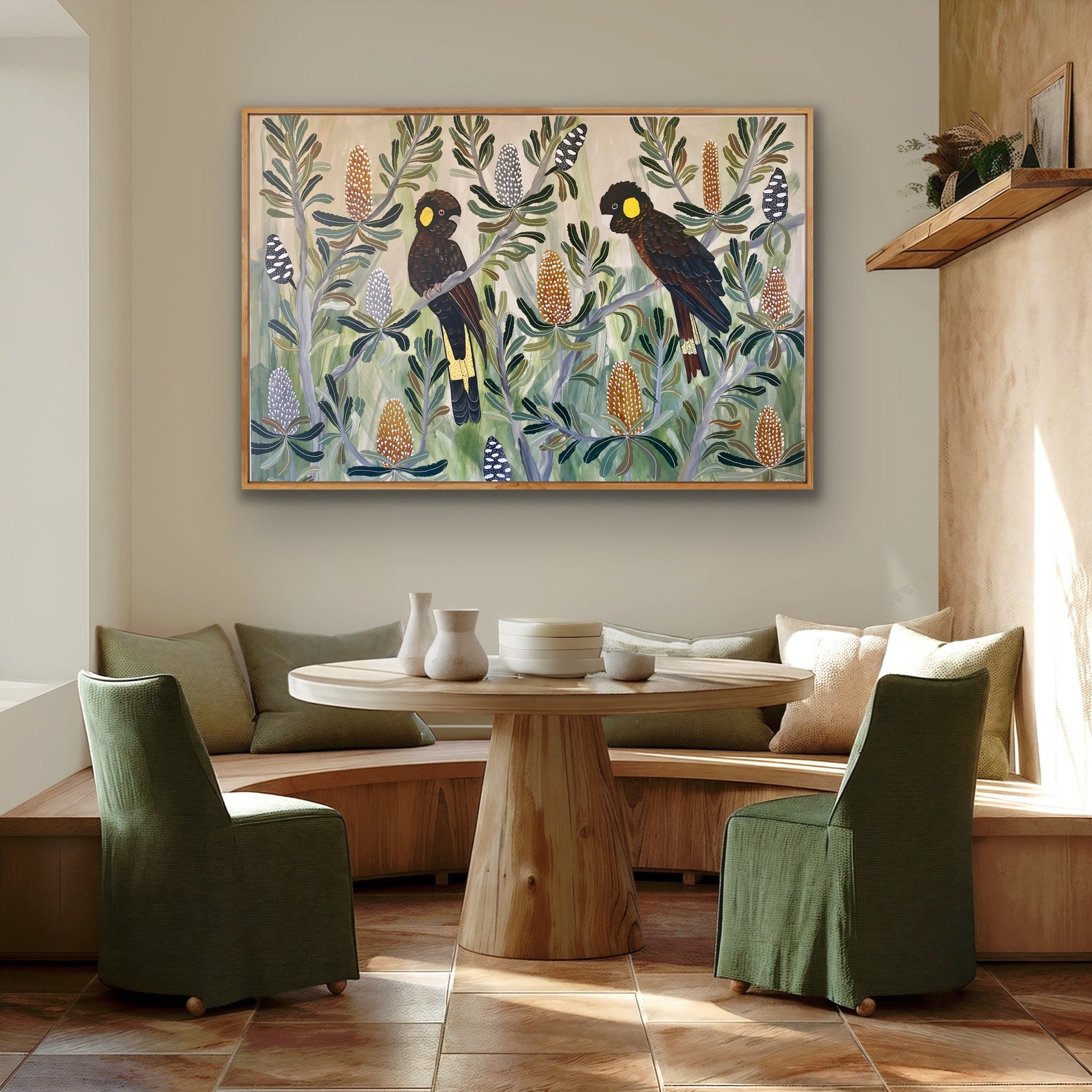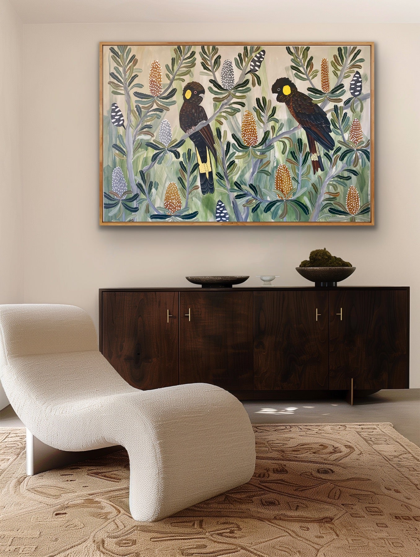 This semi-abstract painting depicts Australian native flowers and a pair of Black Cockatoos. There is a joyful wondrous exuberance in Kate's colourful native botanical artworks.