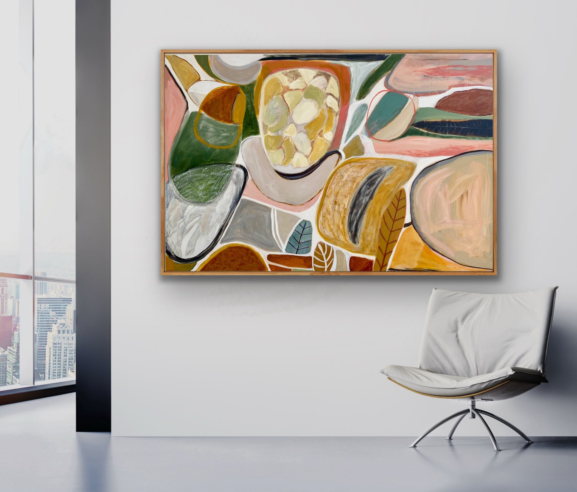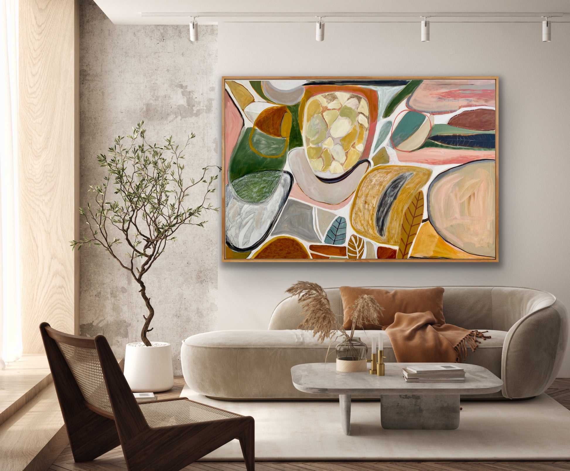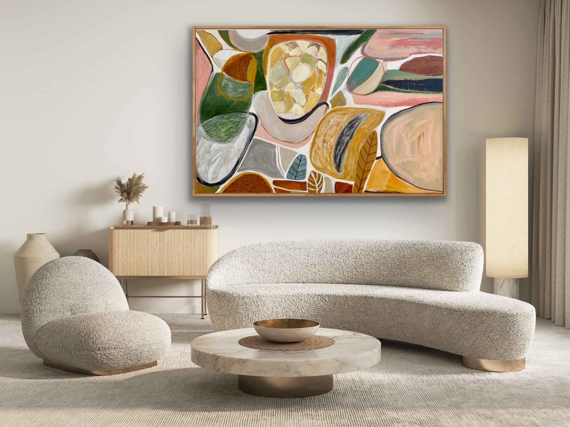 Acrylic and oil stick on canvas 125cm x and 95cm.Framed in Beech and ready to hang.