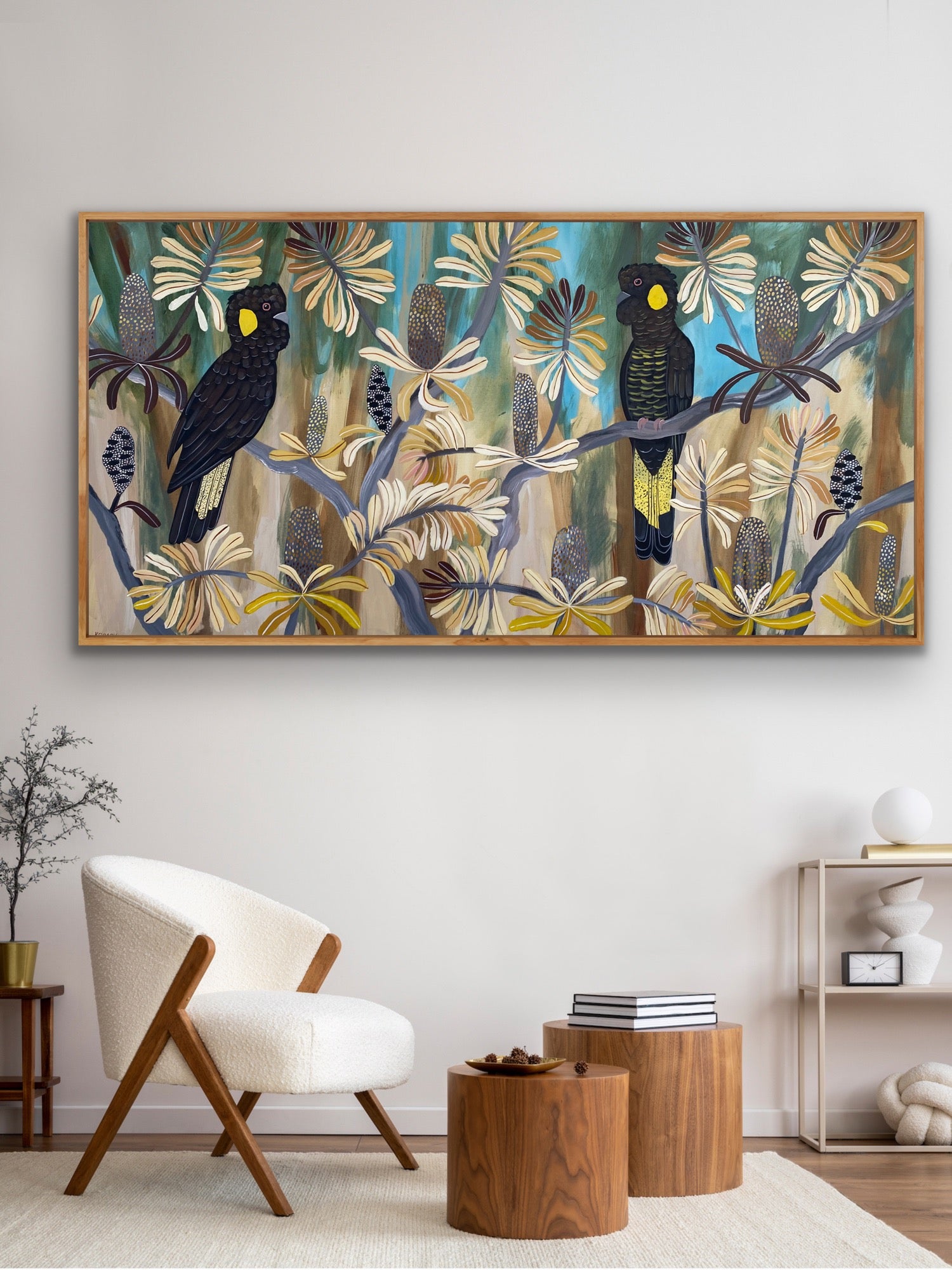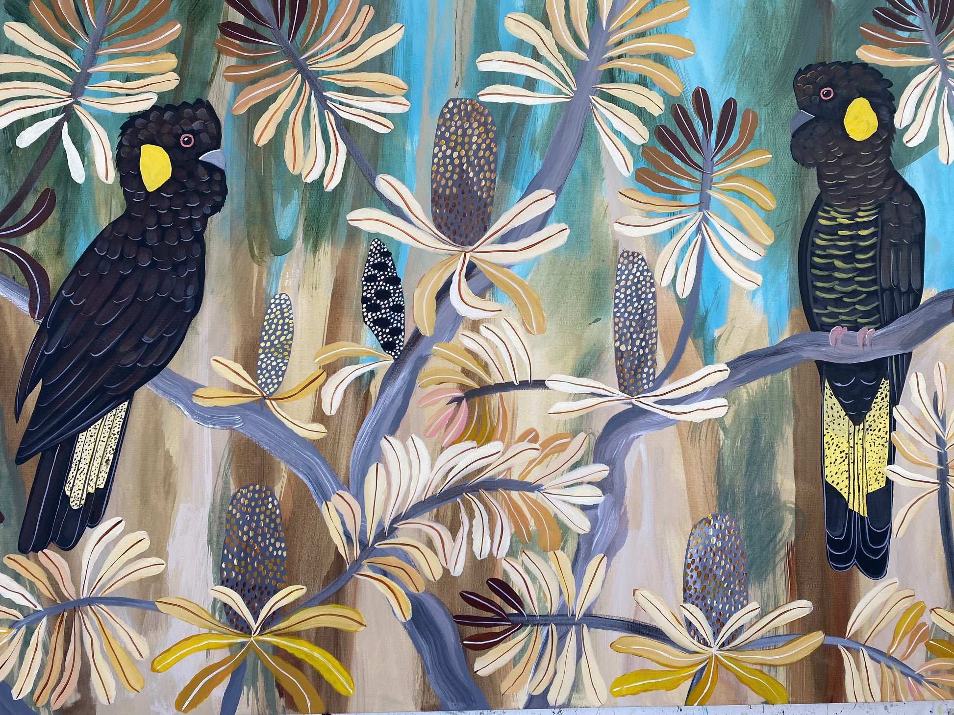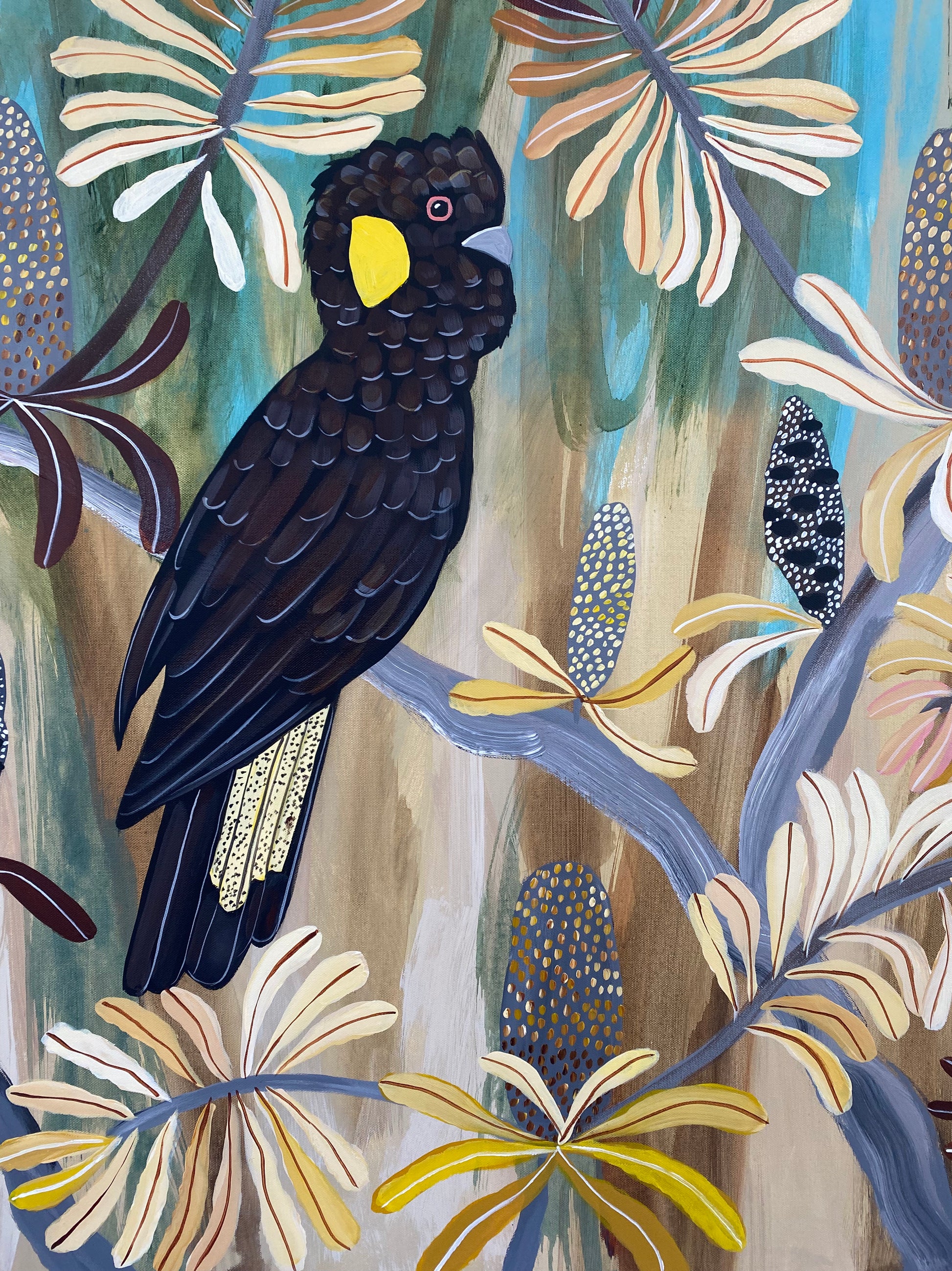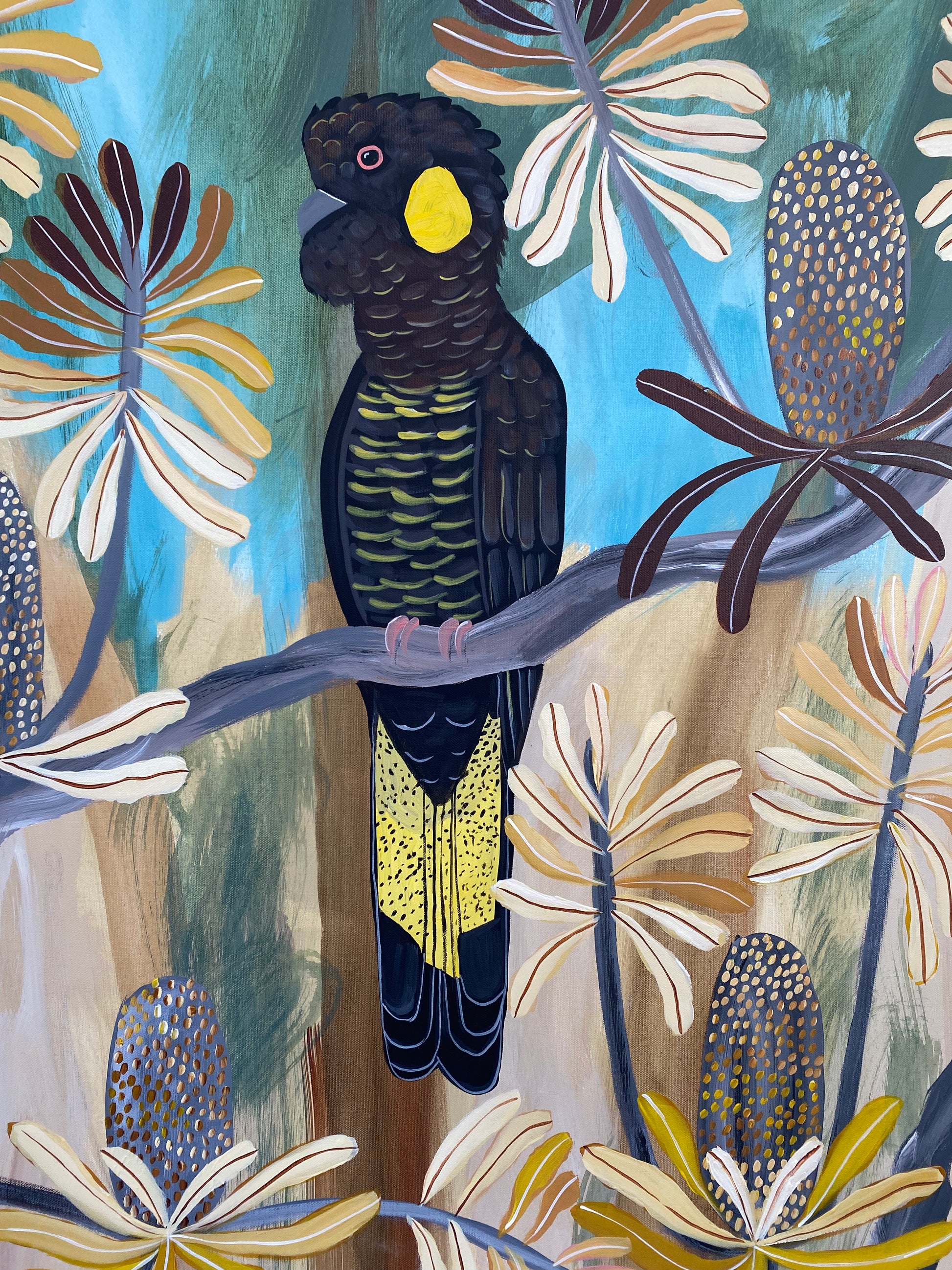 This semi-abstract painting depicts Australian native flowers and a pair of Black Cockatoos. There is a joyful wondrous exuberance in Kate's colourful native botanical artworks.