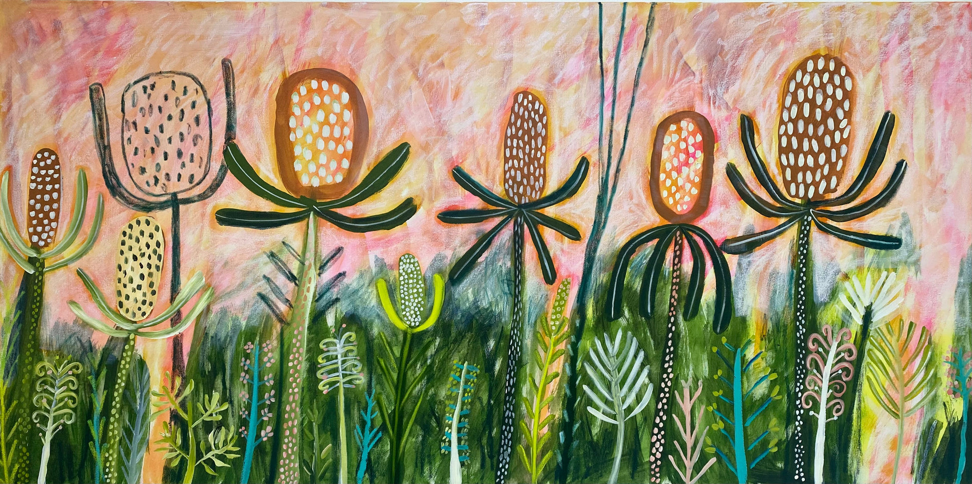 The sonic Native Series is a semi-abstract exploration of the resilient and intricate forms of native Australian flora. These works do not merely depict plants; they capture the vital energy and structural "heartbeat" of the landscape through a sophisticated language of line, texture, and rhythmic movement.