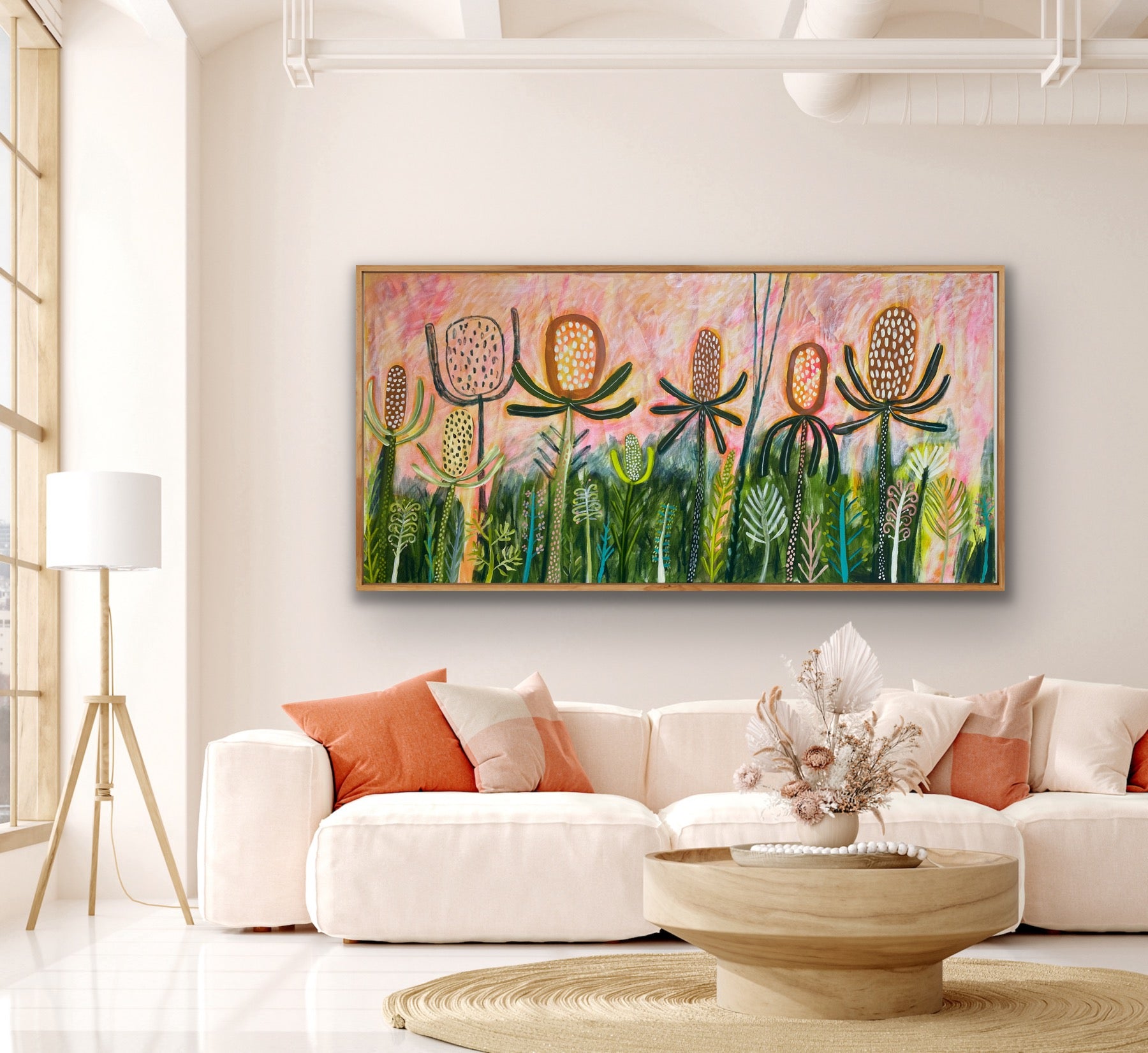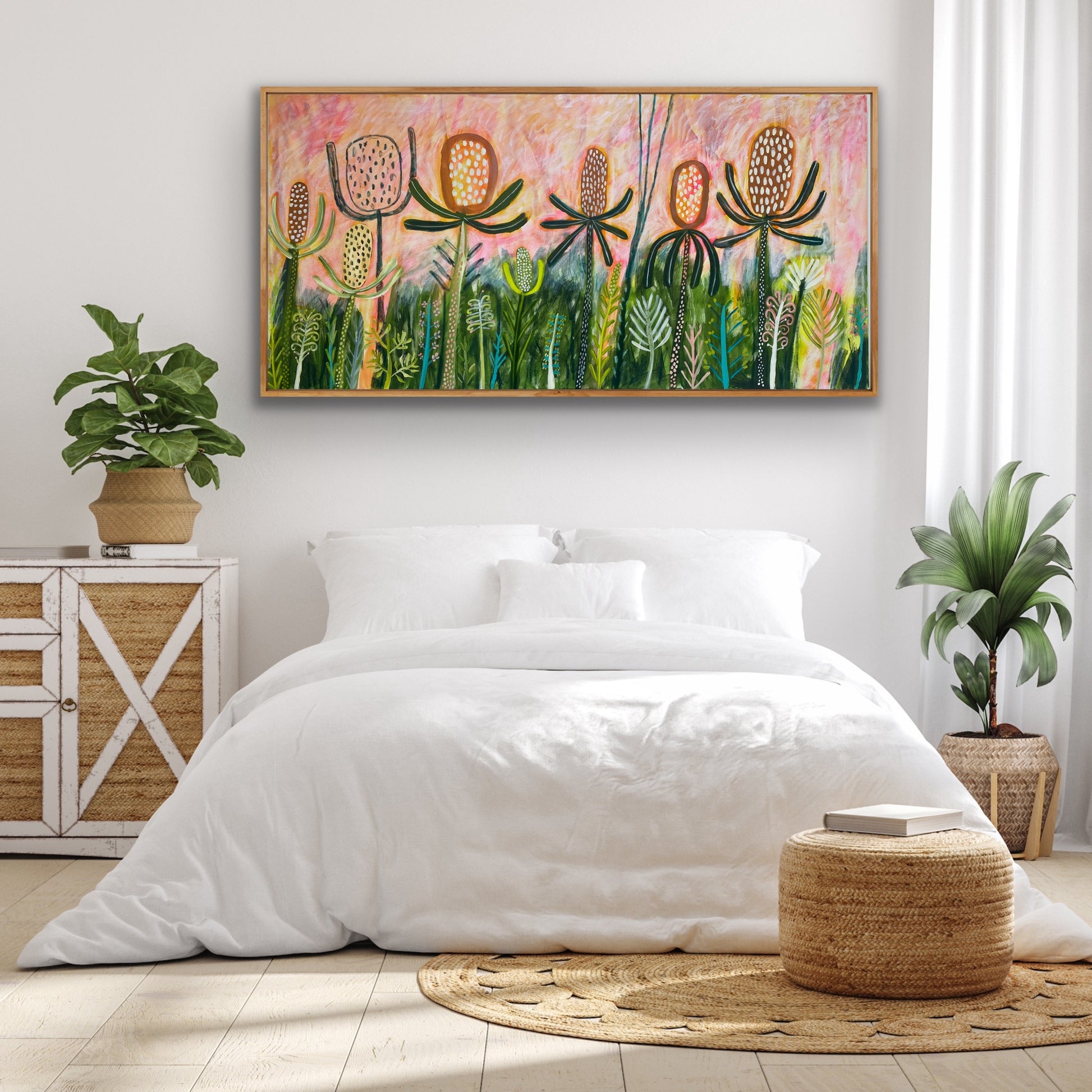 • Organic Palette: A harmonious blend of sunset pinks, dusty ochres, and deep eucalypt greens creates a warm, atmospheric glow reminiscent of the golden hour in the bush.