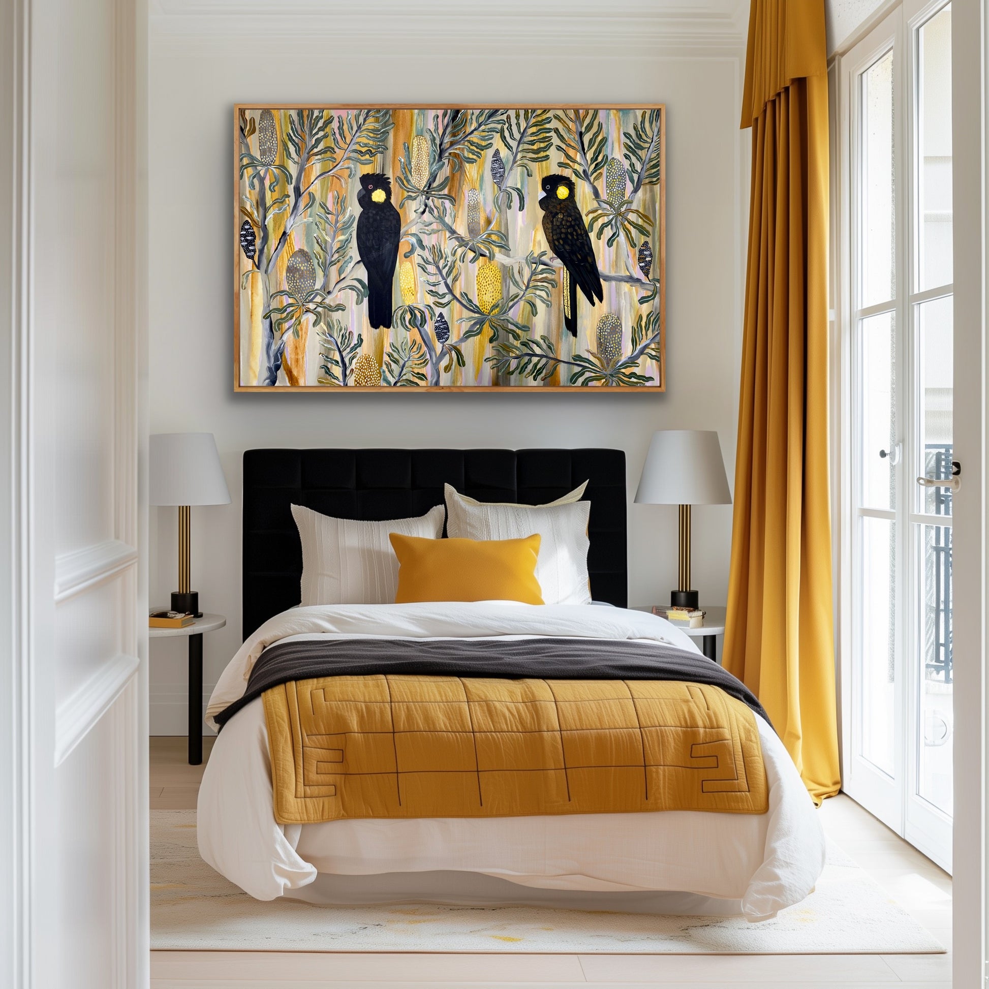 Experience Kate's work inspired by the natural beauty of the Blue Mountains. Her abstract nature series is lyrical through line, colour, and rhythmic forms. This stunning collection features the native flora of the Blue Mountains, including a pair of black cockatoos.