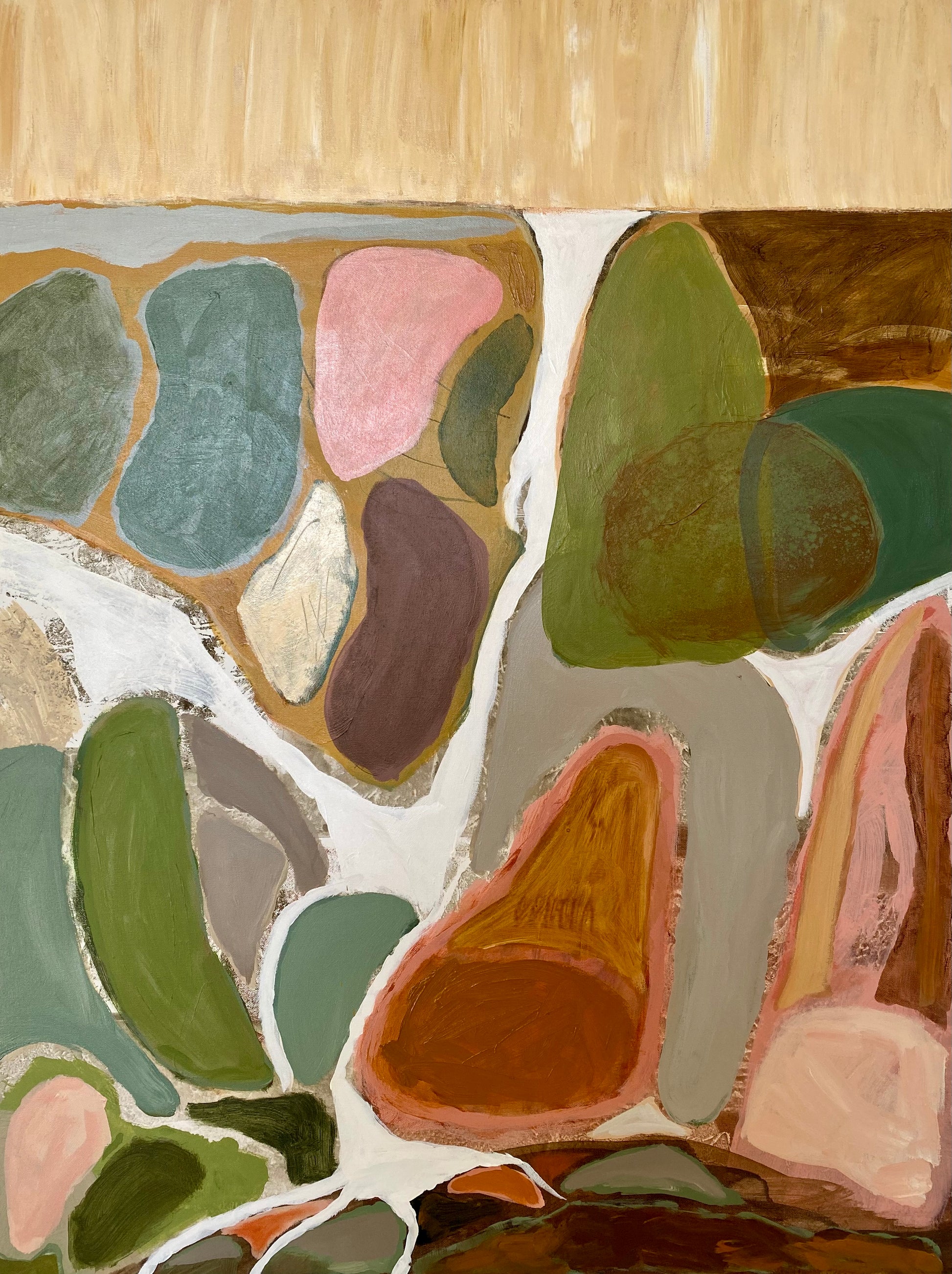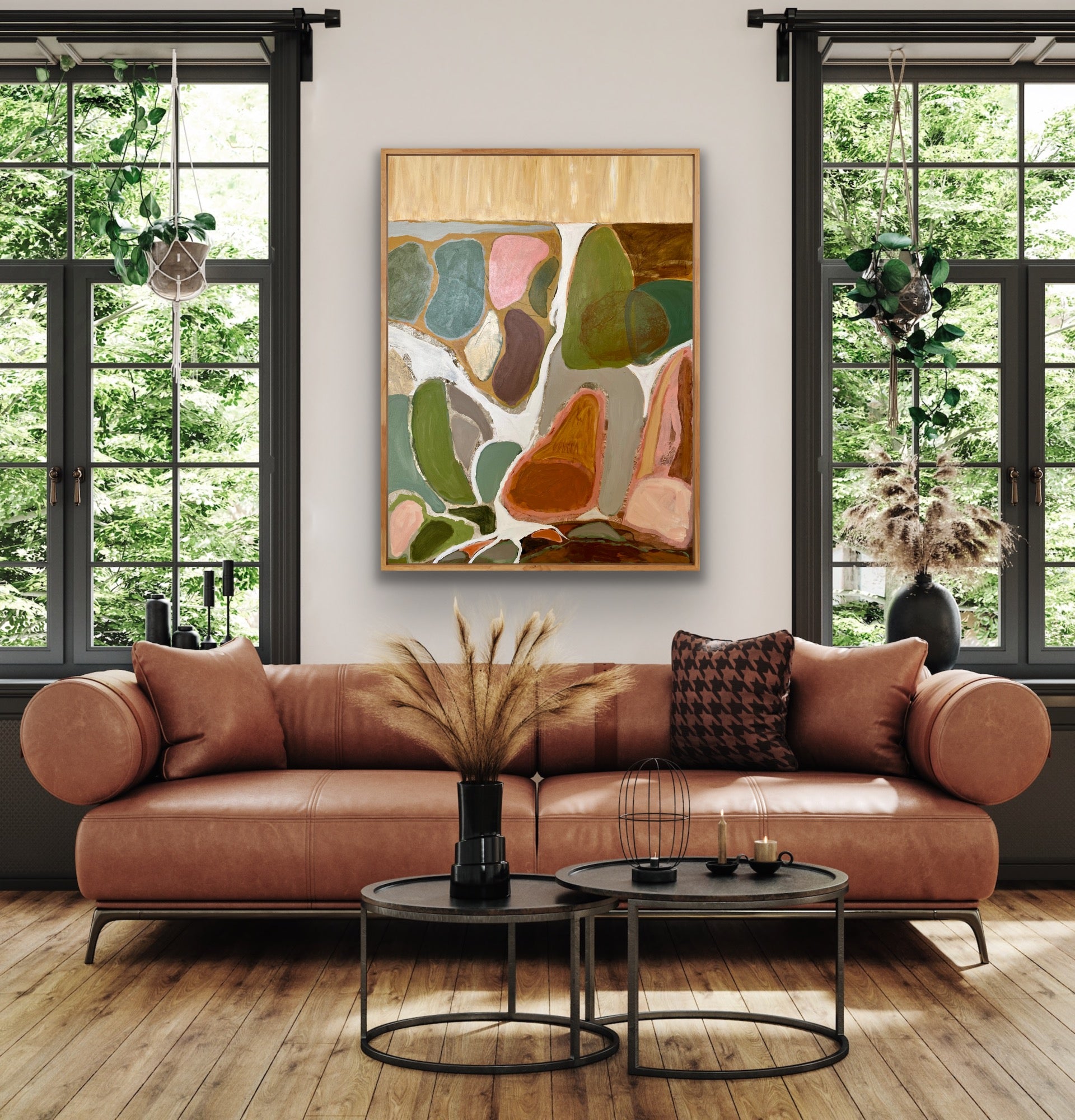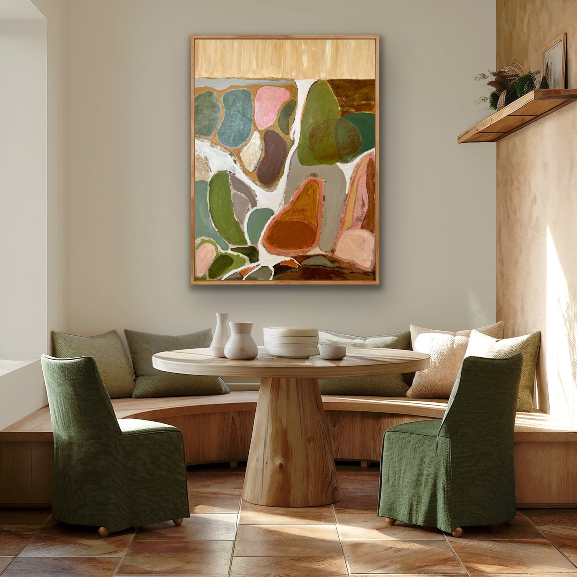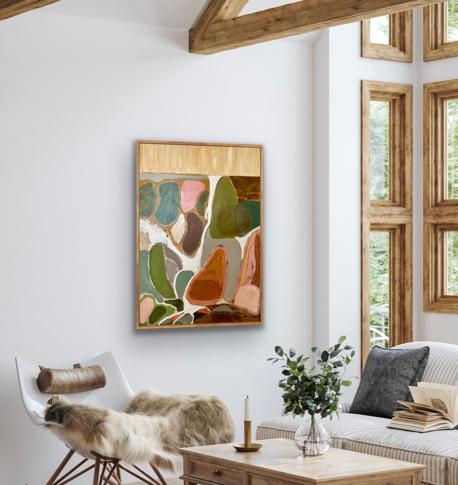 In this vibrant semi-abstract painting, native Australian flora is reimagined through expressive mark-making, rich textures, and harmonious layers of colours, where nature’s forms are both familiar and free.
