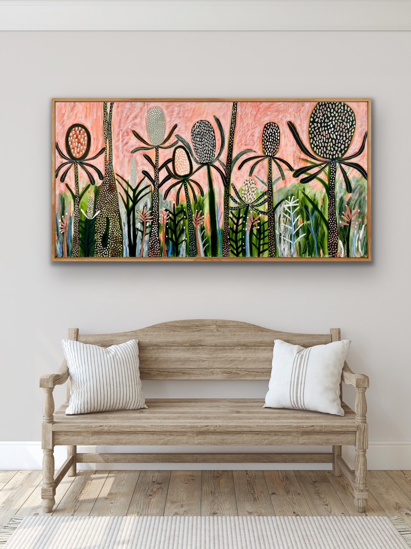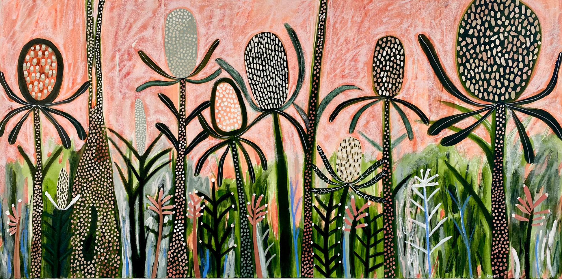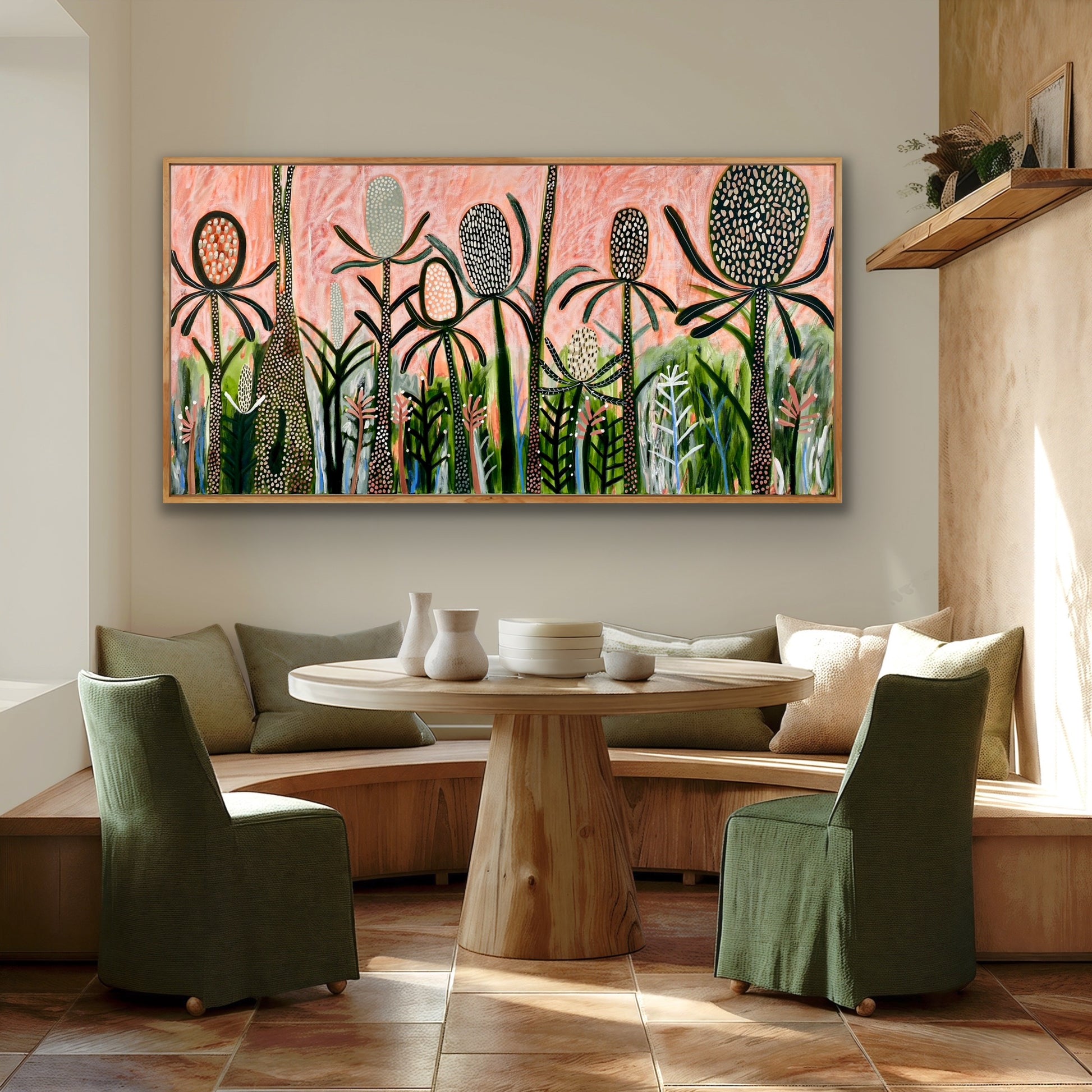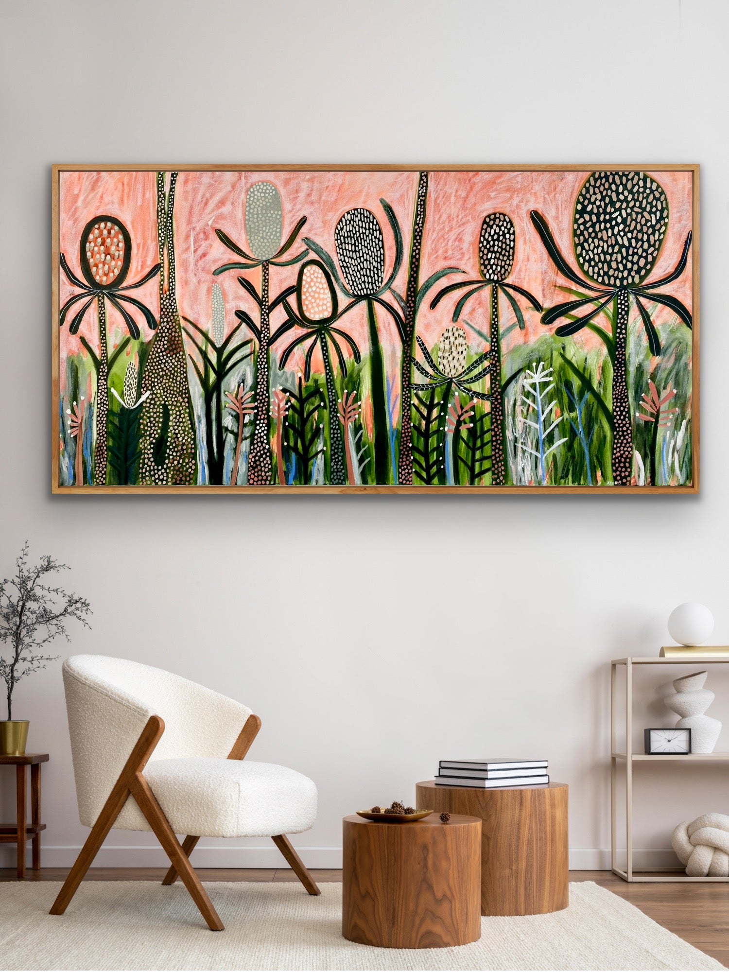 In this vibrant semi-abstract painting, native Australian flora is reimagined through expressive mark-making, rich textures, and harmonious layers of colours, where nature’s forms are both familiar and free. This piece celebrates the raw spirit of the Australian bush through intuitive brushwork and a deeply personal artistic language.